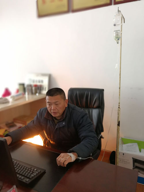 据村党支书何祥彬介绍,他今天早上到村部时,就看见张主任在忙个不停。何书记还说,他看见张主任从村部广场打扫卫生进到办公室时就一直在整理扶贫档案,查看资料,当听见张涛不停的咳嗽声时引起了注意,何书记看见满头大汗,体力不支的张主任感觉到情况不对,便立即找来了村医为张涛做了检查。“重感冒不算什么,我不能躺在病床上吊水,当前脱贫攻坚年度工作在即,我就在办公室里吊水吧”张涛一在坚持说。(文/图刘伟)