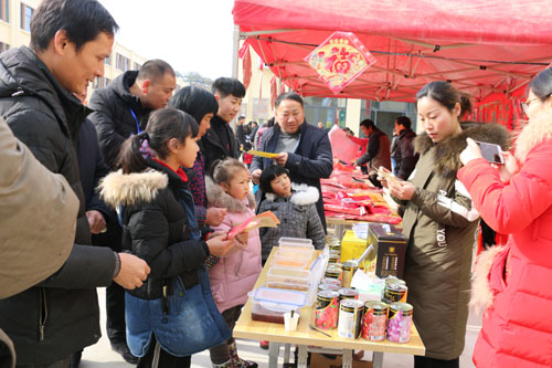 低温冰雪天气抵挡不住浓浓的年味儿,台湾的水果、东北的大米、本地的蒿子粑粑……第一天便吸引了大批当地村民排队购买。