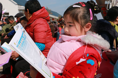 观音岩村村民王荣来乐呵呵地对同来看戏的邻居们说:“现在咱农村的日子是越过越红火了,不愁吃不愁穿。可就是觉着现在这年味越来越淡了。还是政府想得周到,给我们村里人送图书、送春联、送大戏,唱京剧,拉胡琴,演小品,还有宣传十九大精神,介绍各种扶贫的好政策。这样的文化年货我喜欢!”
