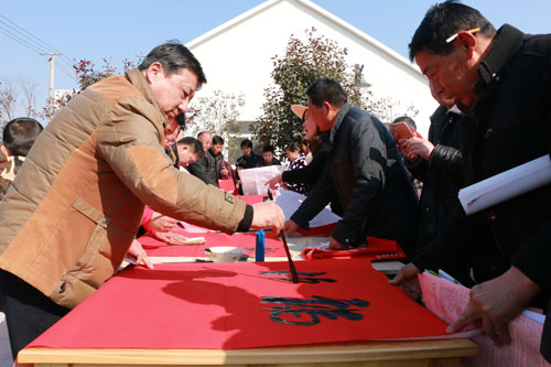 县书协组织书法家现场为群众义写春联的地方围的人最多,来自周边的群众,抢着让书法家们帮自家书写春联,想给来年讨个好彩头。这些“文化年货”给当地乡亲带来了别样的欢乐,人人欢声笑语,处处一片祥和。