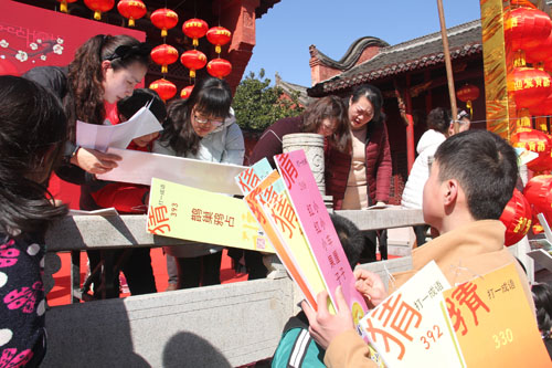 2月23日,正月初八,霍山县城里有着八百多年历史的文庙张灯结彩,欢声笑语一片欢腾,由霍山县县委、县政府主办,县委宣传部、县文广新局承办的“春节文化周”系列活动之一的“猜灯谜”活动正在如火如荼地进行。