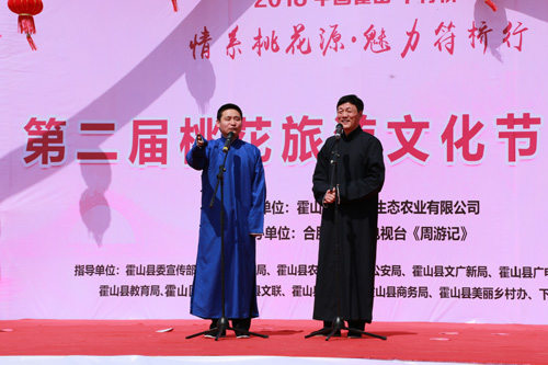 桃花园内,游客们徜徉在粉色的花海中,陶醉在迷人的仙境中,感受着浓浓的春意。游客们或赏花拍照,或欣赏文艺节目,流连忘归。来自下符桥周边各村的村民还在活动场地上搭起了扶贫土特产专柜,卖起了山货。