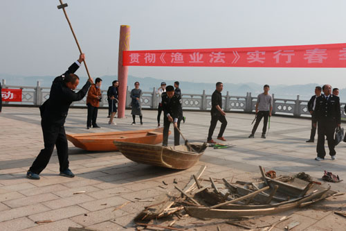 高斌等领导监督非法渔具的现场销毁并在东淠河参与增殖放流活动。