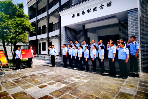 6月30日下午,六安市公安局叶集分局政委郑松林率机关20余名党员干警来到霍山县西镇暴动纪念馆开展庆“七一”建党节主题活动。 连日来,古镇漫水河成了备受关注的红色热土。在该镇西镇暴动纪念馆,前来参观的中、小学生,当地干部群众以及外地游客络绎不绝。许多党支部也纷纷将“七一”建党节主题活动选择在这里举行。他们分别是县公安局机关党支部,县中医院党支部,径树林村党支部,中国电信叶集分公司党支部,县经信委党支部,漫水河镇机关、事业党支部以及西镇社区党支部等。活动分别以缅怀革命先烈,重温入党誓词等形式进行。在鲜艳的党旗下,入党积极分子程勇、周学珍表示一定按照党章和各级党组织的要求,进一步严格要求自己,努力加强自身修养与能力的提升和锻炼,做一名新时代合格的共产党员。“牢记使命,不忘初心,永做党的忠诚卫士。为党旗增色,为青春添彩”霍山县公安局政工主任、支部书记李杰在带领党员干警举行入党宣誓现场说。