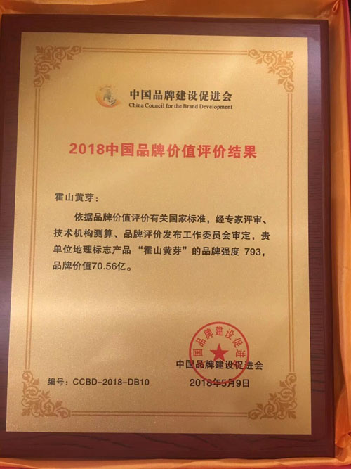 会上,“霍山黄芽”作为区域品牌(地理标志产品)前100强喜获质量品牌推进会授予品牌价值评价结果标牌。此次评价结果为:霍山黄芽品牌强度793,品牌价值70.56亿。