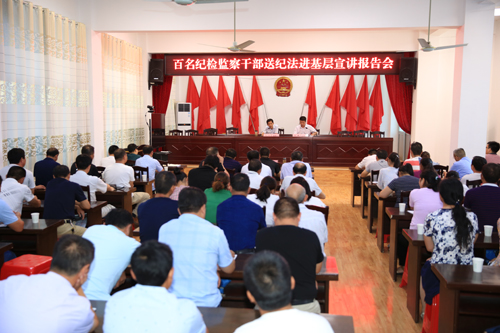 7月25日,霍山县百名纪检监察干部送纪法进基层宣讲报告会在漫水河镇政府礼堂举行,霍山县纪委常委、宣传部长李铁李铁担任主讲。镇党委书记彭臻主持。