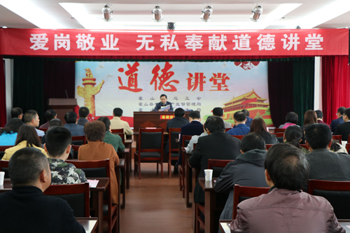此次道德讲堂活动以“爱岗敬业、无私奉献”为主题,通过“听报告、唱歌曲、诵经典、讲故事、谈感悟、送吉祥、做点评”等形式,学习身边模范,品悟道德力量,传播道德种子。