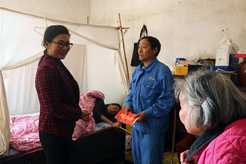 张润之一行来到张有芳老人家中,老人正卧病在床,张润之亲手为老人送上慰问金,并与老人亲属亲切交谈,详细了解老人身体状况和饮食起居情况,嘱咐老人的子女要多多孝敬老人。