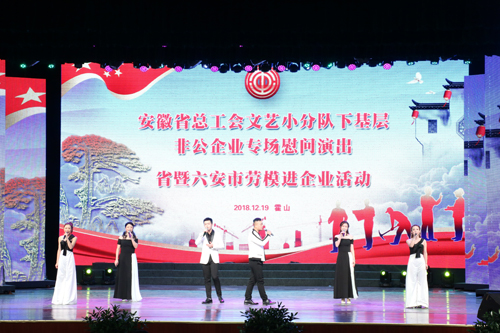 12月19日,“中国梦•劳动美•永远跟党走”省总工会文艺小分队下基层非公企业专场慰问演出暨省、市劳模进企业活动在霍山县迎驾集团举行。省总工会巡视员李素萍,市委常委、组织部长、市总工会主席张日升,县委书记项跃文,县委常委、常务副县长、组织部长、县总工会主席王光军出席活动。