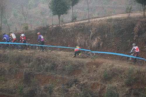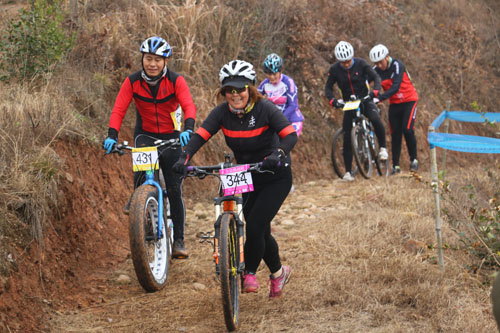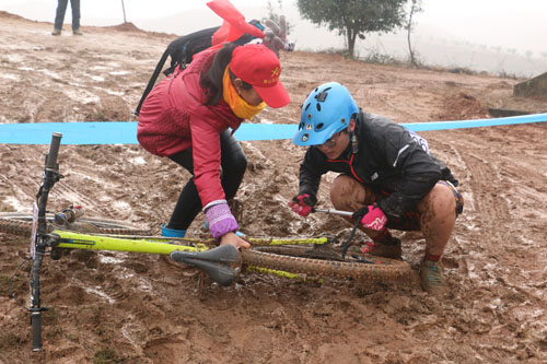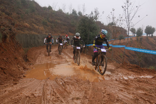 比赛现场人头攒动,彩旗招展,喜气洋洋。随着领导和嘉宾们的一声枪响,比赛正式拉开帷幕。来自全国各地的378名参赛选手如离弦之箭,你追我赶,一个个争相向前。此次比赛共分男子精英挑战组、男子大众挑战组、男子大师挑战组和女子公开挑战组等四个组别,其中男子精英组全程24公里,其余组12公里。比赛场地属于丘陵山地,赛道高低起伏、蜿蜒崎岖,加上此前刚刚下过一场大雨,道路格外泥泞难行,选手们在无法骑行的路段采取手推、肩扛等办法,努力克服各种挑战,奋力拼搏,比赛最终取得了圆满成功。