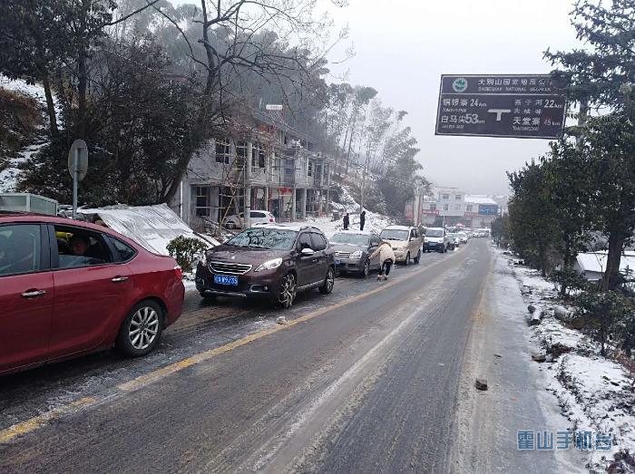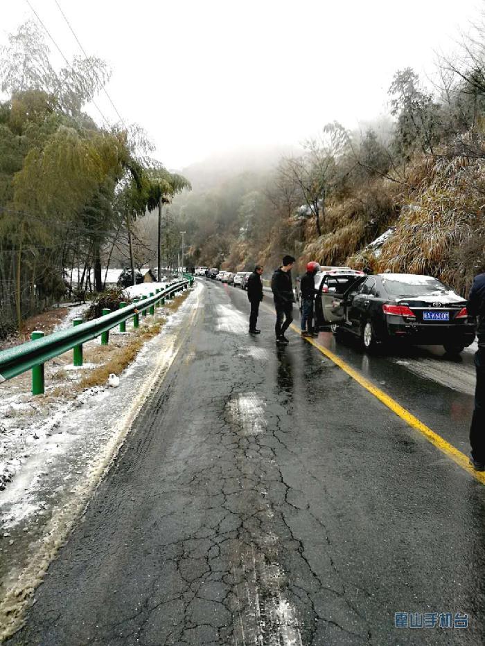 2月7日晚,霍山境内普降冻雨夹雪,导致我县落儿岭镇太子庙、漫水河镇枫树岭、碎石岭等境内的省道三一八线多处路段积雪和结冰,致使该路段交通严重拥堵,大量车辆一度滞留。