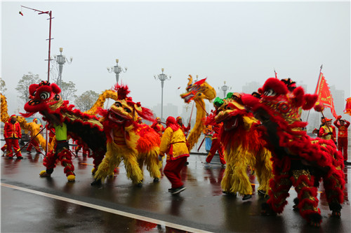 锣鼓喧天、人声鼎沸。2月12日,农历正月初八,虽是小雨轻寒,霍山县城仍然热闹非凡,一年一度的龙狮踩街传统表演活动相继在县政府广场、文峰广场、文庙广场等地陆续上演,为全县人民送上新春的祝福和美好的祝愿。县领导项跃文、赵珞、李玉武、尹如江、朱卫东、王光军、陈明龙、华心扬、檀竹茂、张润之,金正开、郑为鹏、李志刚、郝晓武、纪昌国、朱静、廖华、郭群英、彭光存、方庆林、叶登江等同广大群众一起兴致勃勃地观看了表演。