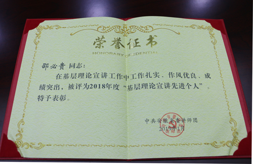 近日,霍山县关工委主任邵必贵被省委讲师团授予“安徽省2018年度基层理论宣讲先进个人”荣誉称号。