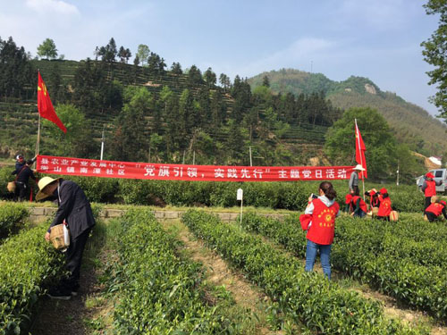 4月16日上午,衡山镇南潭社区联合县农业发展中心党员干部职工一起,来到诸佛庵镇西河口茶叶基地,开展以“党旗引领,实践先行”为主题的党日采茶活动。