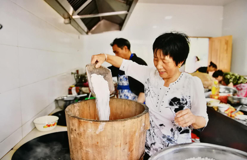 记者在淮源农庄看到,宽敞洁净的厨房里一派繁忙景象。厨师和当地艺人正在进行皋粑制作,一双双巧手上下翻飞,一道道工艺纷繁而复杂。片片皋粑片片情。那一块块香气扑鼻、味美可口的皋粑不仅凝聚着民间艺人辛勤的汗水与智慧,更彰显出西山人对传统西山美食文化孜孜以求的探索精神与无私奉献的殷殷情怀。