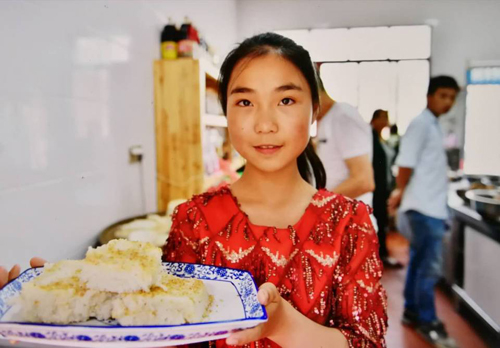 5月18日,一女童在淮源农庄品尝并展示新鲜出炉的皋粑。