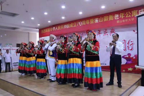 9月30日,霍山徽衡老年公寓内红旗招展,欢歌不断,处处洋溢着节日的氛围。县老年大学的老年学员和老年公寓职工自发组织了一台文艺汇演,和在此养老的300余名老人一起共同庆祝新中国成立70周年。