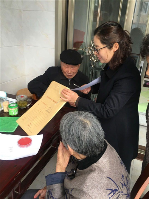 近日,87岁且腿脚不便的高龄老人项昌学足不出户便为女儿办好了房产过户面签手续,不动产登记窗口将业务从“柜内”延伸到“柜外”,窗口负责人杨德美和服务明星葛伶俐利用休息日,带上需要面签的相关资料,来到老人的住所进行上门服务,老人对她们的热情和贴心的行为赞不绝口、非常满意。