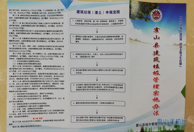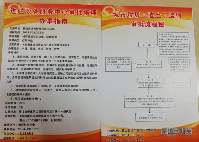《安徽省城市市容和环境卫生管理条例》第二十五条明确规定:“因工程施工等原因产生的渣土、弃土、弃料等废弃物,需要运输、处理的,应当按照城市人民政府市容环境卫生行政主管部门规定的时间、线路和要求,清运到指定的场所处理。”《霍山县建筑垃圾管理实施办法》第十一条和第二十条明确规定:“建设单位(施工单位)需要处置建筑垃圾的,应当向城市管理执法部门申请建筑垃圾处置许可,并按规定缴纳处置费”,“建筑垃圾运输企业在运输建筑垃圾前,应当持建设单位的建筑垃圾处置证副本,向城市管理执法部门申领建筑垃圾运输准运证。准运证应当载明建设工程名称及地点,运输车辆牌号、运输路线、运输时间、弃置场地”。
