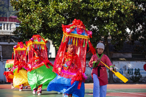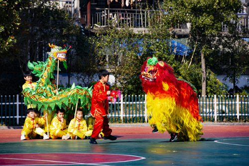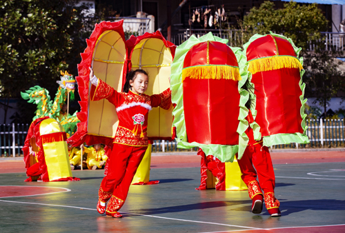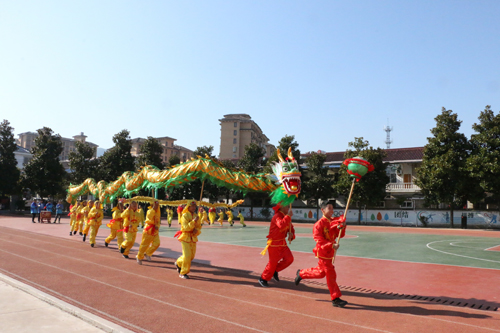 舞龙队矫健灵活、舞狮队威武雄壮,大头娃娃表演憨态可掬,八只美丽的蚌壳和一位滑稽的老渔翁表演的蚌壳舞生动活泼,还有犟驴表演和旱船表演,就连流传了300多年的霍山民俗舞蹈连响舞也在这所百年老校的校园里“响”了起来。
