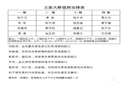 灾难无情人有情。在这场战役中,许多村民都自发参与到防疫斗争中来。上土市镇龙金村村民,为了减轻村干部负担,为家乡防疫工作奉献自己的力量,他们自发担当起了在各大路口值班的任务。为了让工作更加有序,村民们还制定了详细的值班表,认真守护各大路口的安全。