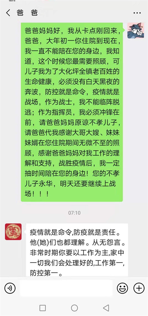“战胜疫情后,我一定抽时间陪在您的身边!您的不孝儿子永华,明天还要继续上战场!”在连续值班18小时后的凌晨,苏永华给父亲发了一段微信。原来苏永华的父亲在年前因为身体原因住院透析,身为儿子却无法陪伴左右,让他充满了愧疚感。而父亲的理解和支持又让他内心感到温暖,“父亲是个老党员,也是位老医生,一直教育我要赤胆忠诚、勇于担当,家人的理解和支持让我毫无后顾之忧的站在这里,为人民而战斗!”(余文)