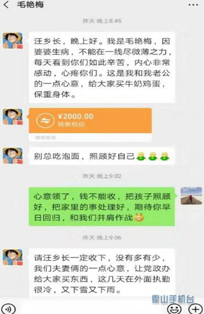 “汪乡长,晚上好。我是毛艳梅,因家人生病不能在一线尽微薄之力,每天看到你们如此辛苦,心疼你们。这是我和老公的一点心意,给大家买点营养品,保重身体。”昨天夜里汪琴乡长突然收到这样一条微信,并看到两千元的转账记录。