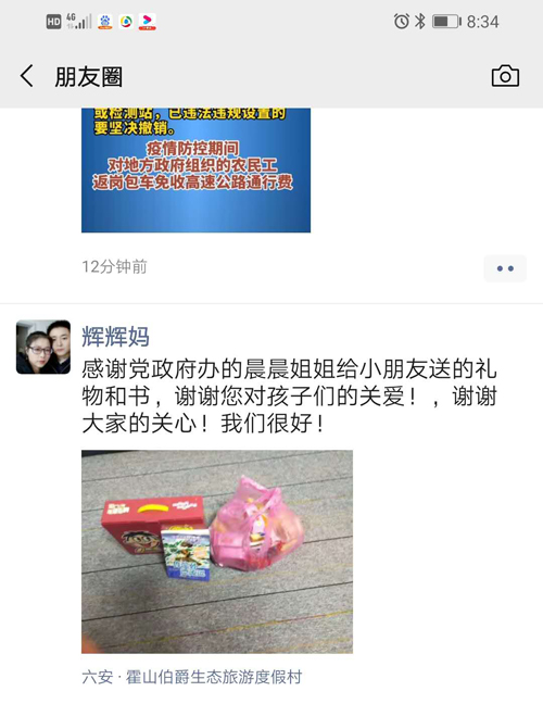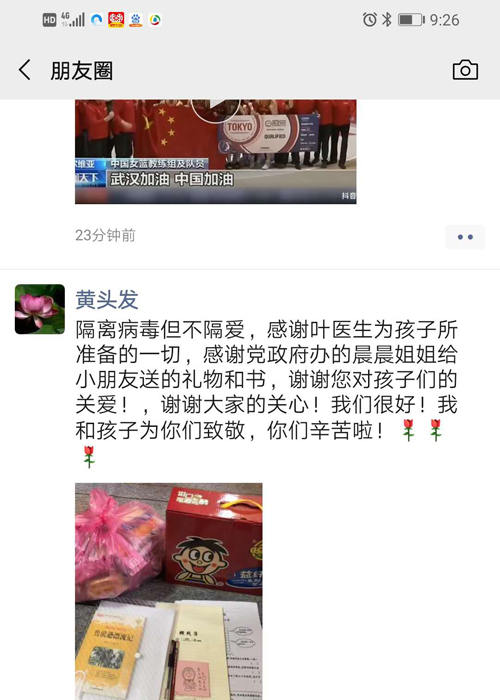 “隔离病毒并没有隔离爱,感谢叶医生为孩子们准备的一切,感谢晨晨小姐姐给小朋友送的书和礼物,感谢所有人对我们的关爱,谢谢大家的关心,我们很好,有你们相伴,我们一定能战胜疫情,走出这里……”收到隔离区外给杨睿小朋友送来的作业和礼物,杨睿的妈妈在微信群里再三致谢。