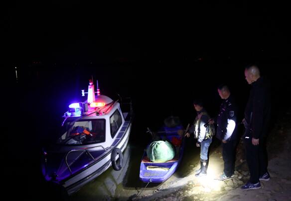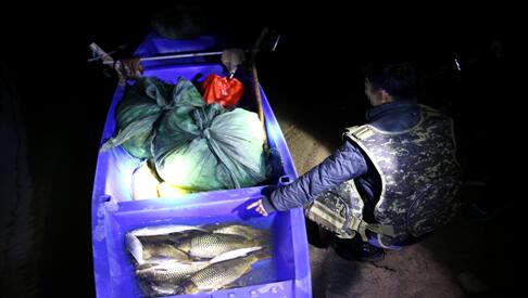 “二组、二组,一组于东淠河橡胶坝河段,发现有人划船下网”。4月15日晚22时许,正在开展渔政巡查行动的霍山县农业执法大队对讲机传来一阵低促的声音。“为保障人身安全,请一组、二组分别在淠河南北岸蹲守设伏,待嫌疑人靠岸后再展开行动”执法大队带队领导用对讲机布置到。直至4月16日凌晨3点10分,执法队员们将收网靠岸的非法捕捞嫌疑人刘某查获,现场收缴渔船1艘,渔网3幅,捞兜1个,渔获物若干。