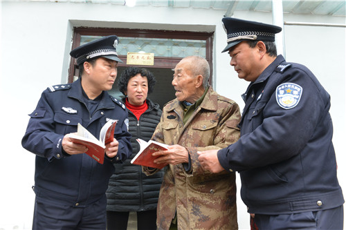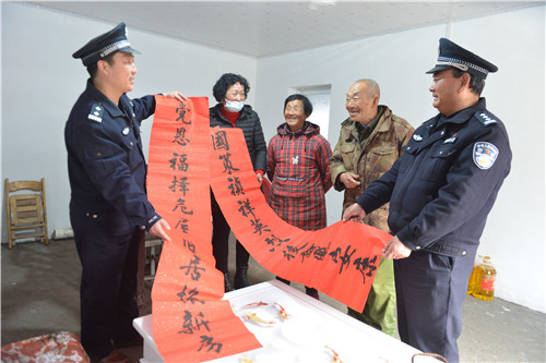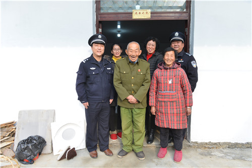 丁从坤是土地革命时期革命烈士丁楷的继子,今年已是88岁高龄,患有肢体二级残疾和帕金森、高血压等慢性病,目前和老伴生活在一起,暂时生活还能自理。他家是建档立卡贫困户和低保户,于2019年脱贫。在政府为老两口翻盖的新家中,程杰一行与老人促膝谈心,仔细询问了老人的家庭生活和健康状况,有没有什么需要帮助解决的困难,并感谢烈士们为今天的幸福生活作出的巨大牺牲和贡献,让处于暮年的老人家切实感受到党和政府对他们的亲切关怀。丁从坤对党和政府的关怀十分感激,激动得拿出自己创作请人书写的一幅对联“党恩福泽危房旧居换新房,国策祯祥英烈后裔乐安康”,口中不住地念叨着感谢的话,以此表达心中的感激之情。汤广存也是烈士后代,两个儿子都在外地工作。他利用大别山旅游快速通道过境优势和党的富民政策,筹划着从事农家乐生意,不给政府添负担。在他尚未完工的农家乐房子里,派出所走访民警给他们送去慰问品和新春祝福。