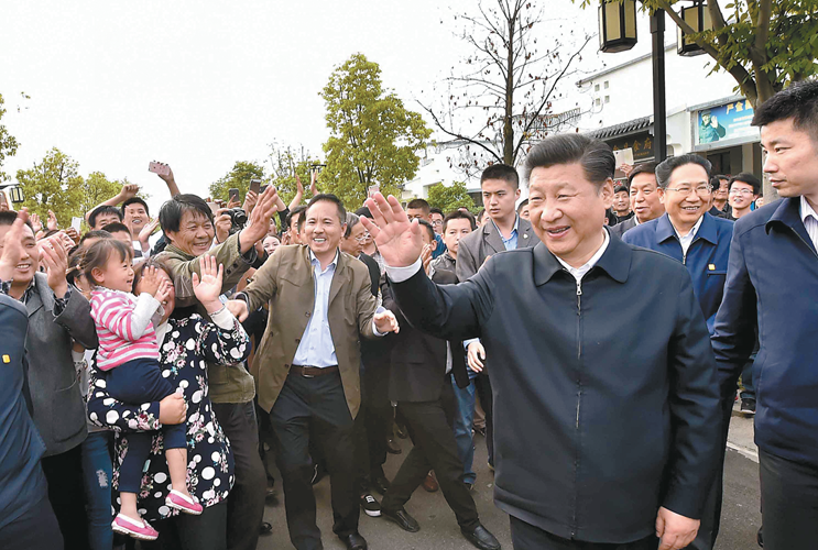 2016年4月25日下午,习近平在滁州市凤阳县小岗村向村民们问好。 新华社记者 李涛 摄