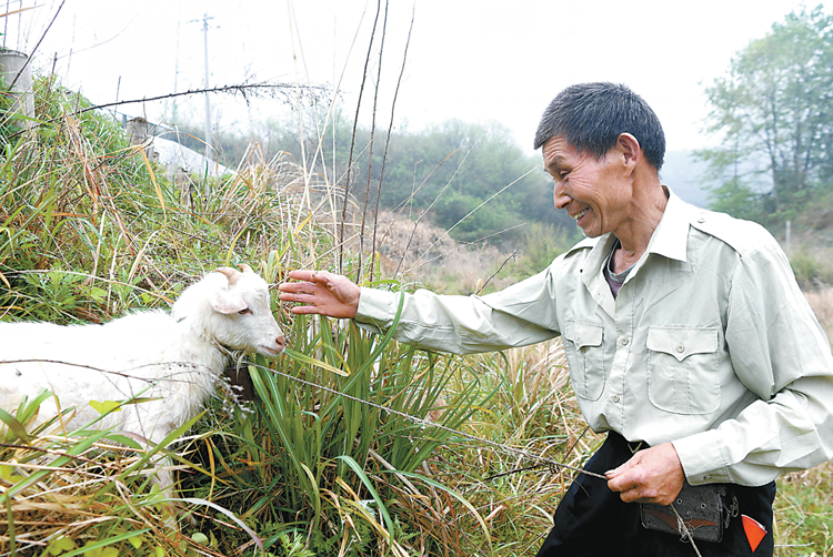 清晨,大湾村村民陈泽申将山羊赶往山坡草场。去年,陈泽申通过销售山羊一项就收入12000多元。本报记者 吴文兵 摄