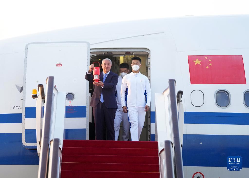 10月20日,在北京首都机场,北京冬奥组委特别代表、北京冬奥组委副主席于再清(左)手持火种灯走出舱门。随着北京冬奥组委赴希腊代表团抵达首都机场,北京冬奥会火种顺利抵达北京。新华社记者 张晨霖 摄