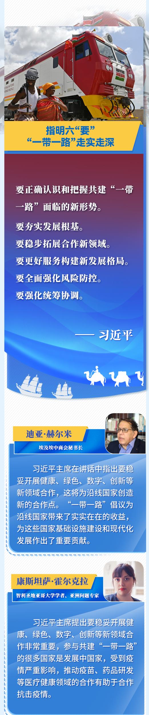 习近平强调,要更好服务构建新发展格局。要统筹考虑和谋划构建新发展格局和共建“一带一路”,聚焦新发力点,塑造新结合点。要加快完善各具特色、互为补充、畅通安全的陆上通道,优化海上布局,为畅通国内国际双循环提供有力支撑。要加强产业链供应链畅通衔接,推动来源多元化。要优质打造标志性工程。民生工程是快速提升共建国家民众获得感的重要途径,要加强统筹谋划,形成更多接地气、聚人心的合作成果。