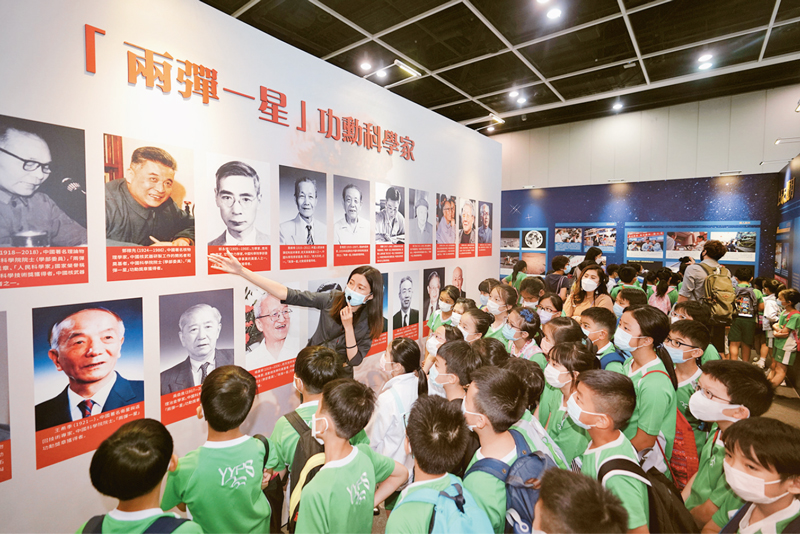 2021年6月27日至7月9日,“时代精神耀香江”之百年中国科学家主题展在香港向公众开放。图为7月7日,众多小学生仔细聆听讲解员的介绍。 中新社记者 张炜/摄