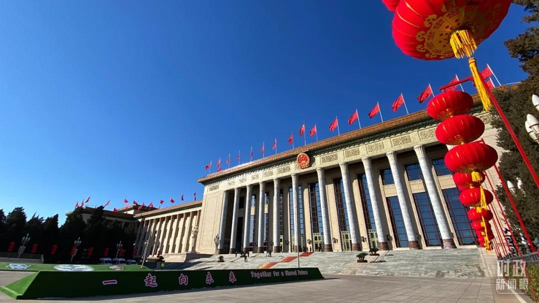 △人民大会堂外,为迎接冬奥新设计的“一起向未来”字样格外醒目。(总台央视记者石奇用拍摄)