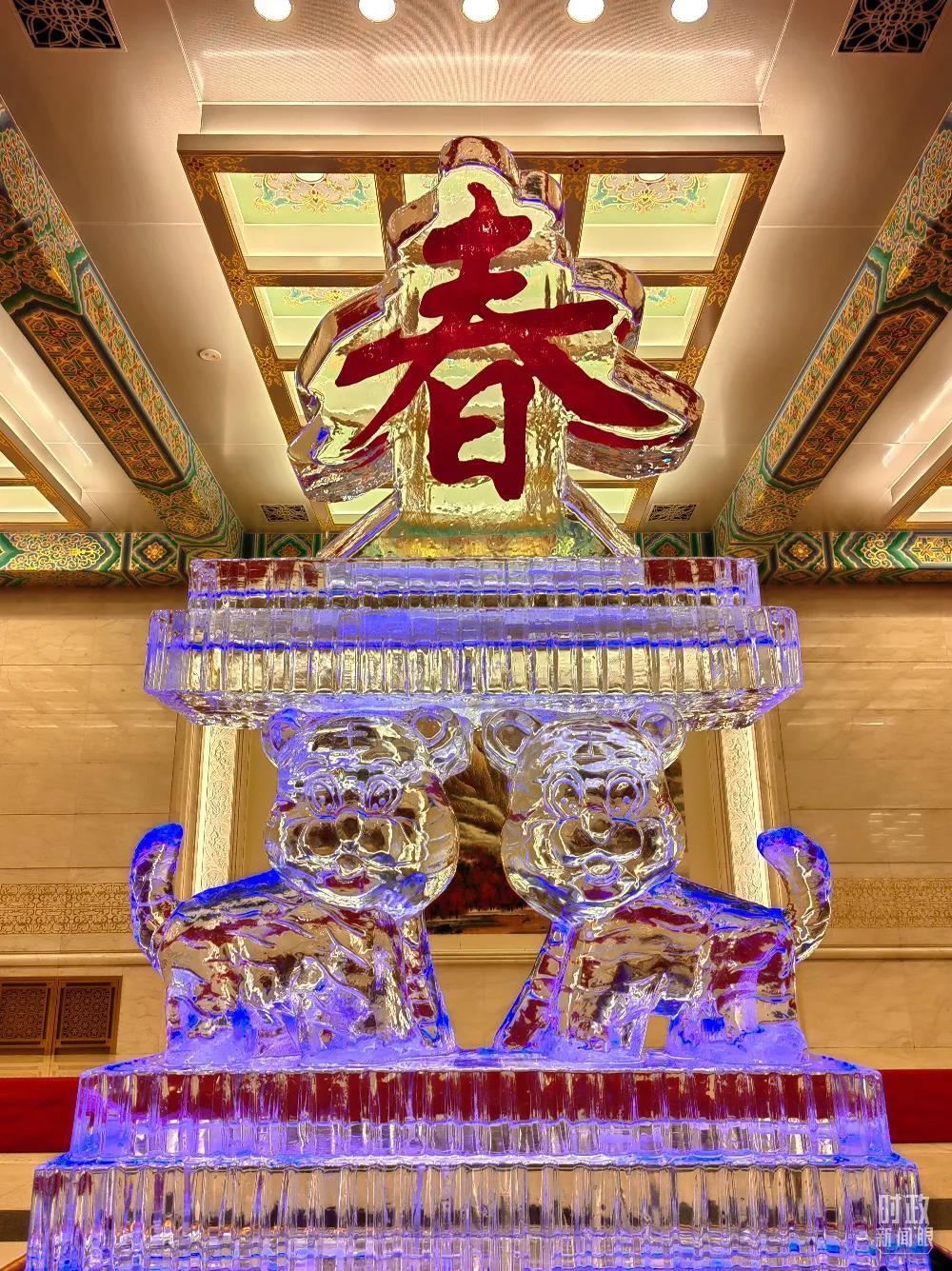 △宴会厅摆放的“春”主题冰雕。(总台央视记者钟锋拍摄)