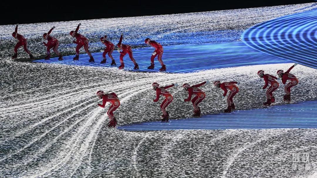 △开幕式上,滑冰运动员滑过冰面后,留下长长的轨迹。(总台国广记者李晋拍摄)