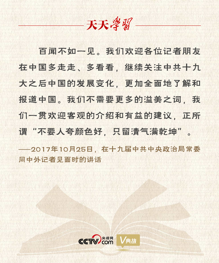 2017年10月25日,在十九届中共中央政治局常委同中外记者见面时,习近平总书记对中外媒体表示“我们不需要更多的溢美之词,我们一贯欢迎客观的介绍和有益的建议”,并在讲话中引用了“不要人夸颜色好,只留清气满乾坤”,体现了新一届中央领导集体不慕虚名、真抓实干的务实作风。时隔不久,在2018年新年贺词中,习近平总书记进一步阐释道:“不驰于空想、不骛于虚声,一步一个脚印,踏踏实实干好工作。”