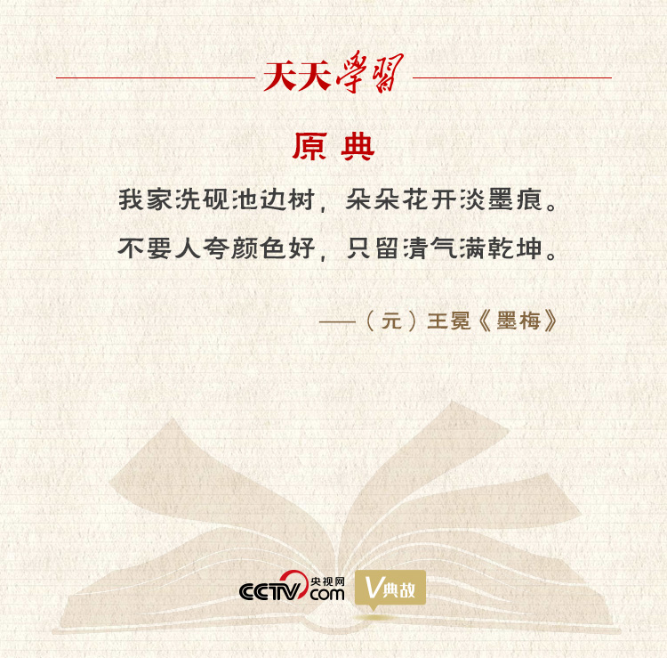 “不要人夸颜色好,只留清气满乾坤”,出自元代诗人、画家王冕《墨梅图》上的自作题画诗。第一句“我家洗砚池边树”,点出了梅花所在的位置。“洗砚池”,借用书圣王羲之“临池学书,池水尽黑”的典故,暗藏一个“墨”字。第二句“朵朵花开淡墨痕”,王冕画梅淡墨点染,不用浓墨重彩。三、四两句“不要人夸颜色好,只留清气满乾坤”,盛赞梅花的高风亮节。墨梅并不以鲜艳的颜色吸引人、讨好人,博得人们的赞美,只愿散发缕缕清香,充溢在天地之间。诗人赋予梅花以人的品性,巧妙地将画格、诗格、人格有机地融为一体。