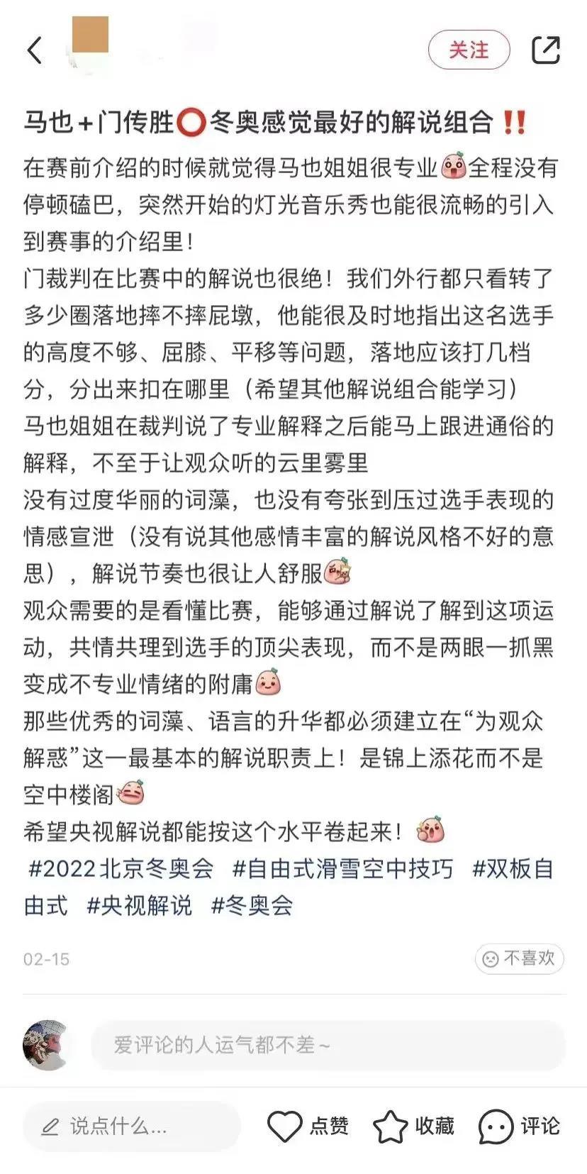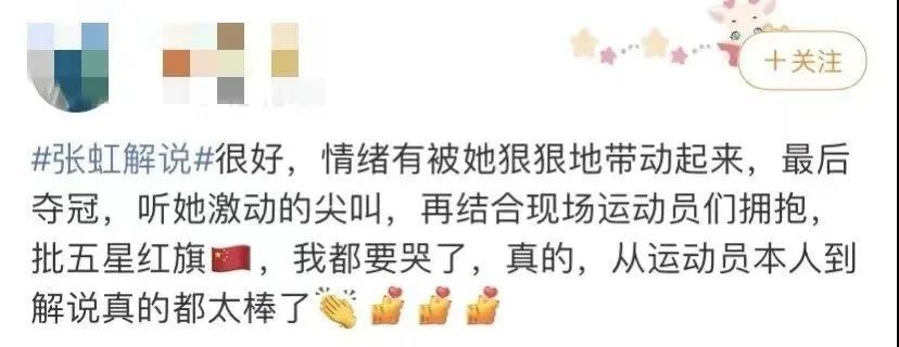 高亭宇赢得北京冬奥会速度滑冰男子500米“飞人大战”。总台解说嘉宾、索契冬奥会速度滑冰女子1000米冠军张虹在解说中难掩激动。赛后她说“我可能不是最完美的解说”,网友却纷纷表白“没有您的专业解说,我其实不懂这项运动的规则;没有您的呐喊,我大概不会热泪盈眶”。