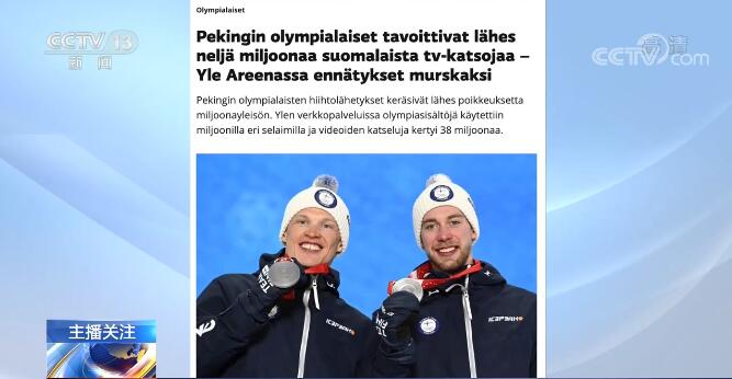 芬兰国家广播公司报道称,在人口仅有550多万的北欧国家芬兰,该公司播出的北京冬奥会相关电视节目吸引了约390万观众。北京冬奥会还使该公司制作的流媒体服务收视达到了历史最高水平。