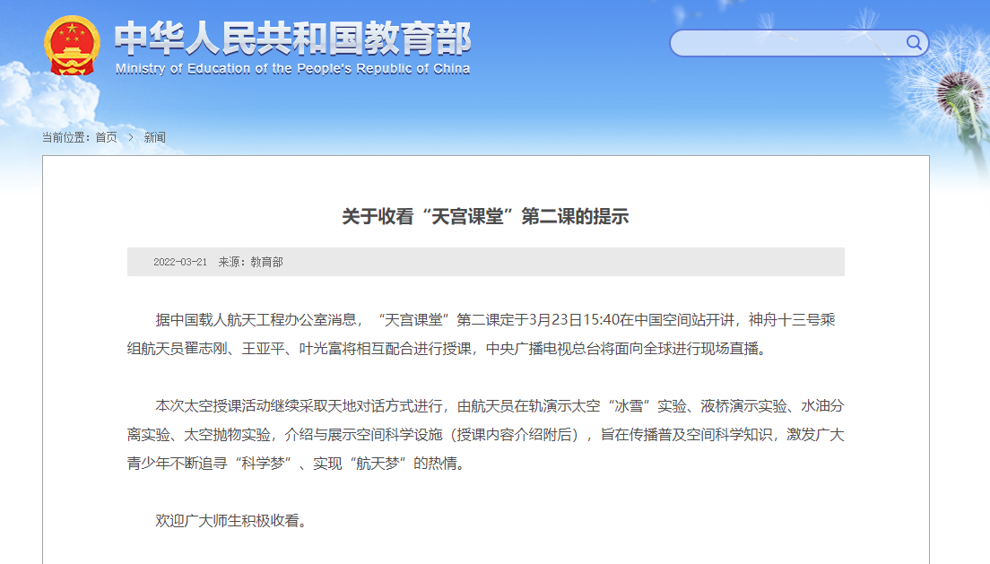 教育部近日发布关于收看“天宫课堂”的提示,全文如下: