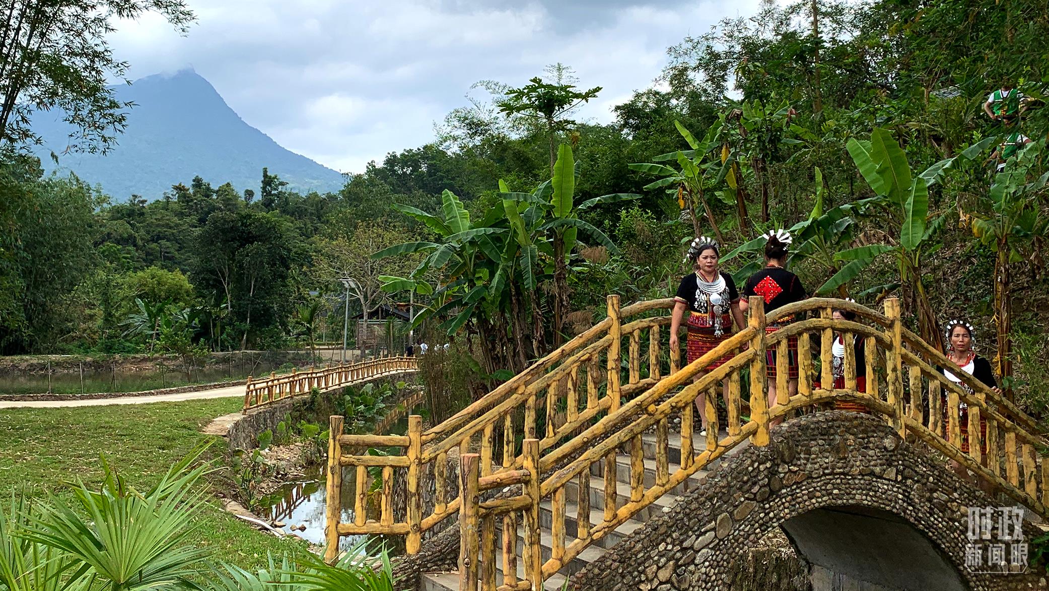 △五指山脚下的黎族村寨与当地村民。(总台央视记者段德文拍摄)