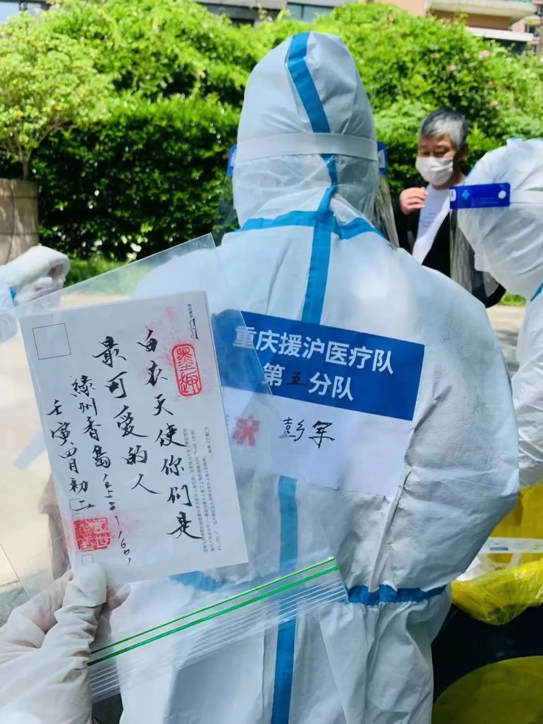 “日晒雨淋、衣服湿透、双手浸皱,但大家从不叫苦。”潘传波动情地说,截至5月6日,重庆市援沪医疗队已开展核酸采样289.8万人次,“队员们高效、专业、严谨的服务,得到居民的高度赞赏,很多人自发送来感谢信、明信片和祝福卡,让我们感到非常暖心。我们再苦再累,也要帮上海打赢大上海保卫战。”