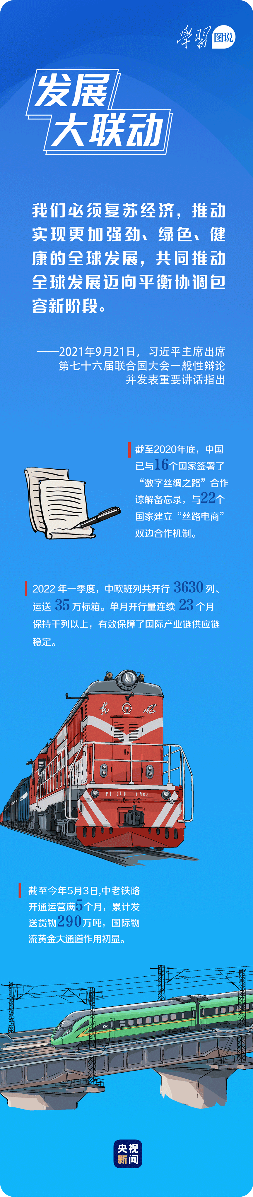 截至目前,我国已与149个国家、32个国际组织签署200多份共建“一带一路”合作文件,“一带一路”朋友圈不断扩大。中国倡议日益成为国际社会广泛共识,中国发展为世界发展注入强大动力,“一带一路”建设结出累累硕果。