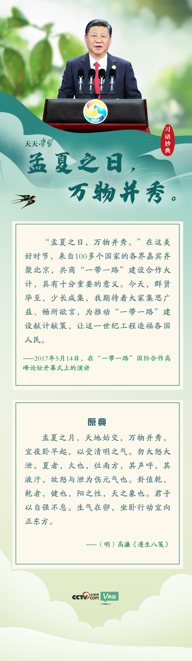 2017年5月14日,习近平主席在北京出席“一带一路”国际合作高峰论坛开幕式,并发表题为《携手推进“一带一路”建设》的主旨演讲。开幕式当天是农历四月十九日,适值“孟夏之日”。此时的北京初夏刚至,风暖昼长,阳光明媚,蓝天、白云、山水和古建筑相映成趣,大地郁郁葱葱,一片生机盎然。在演讲开场白中,习近平主席将古人成句“孟夏之月,万物并秀”信手拈来,易“月”为“日”,与眼前万物勃发、生机盎然的京城美景相呼应,也让与会嘉宾们感受到中国人民的热情,堪称妙用天成。