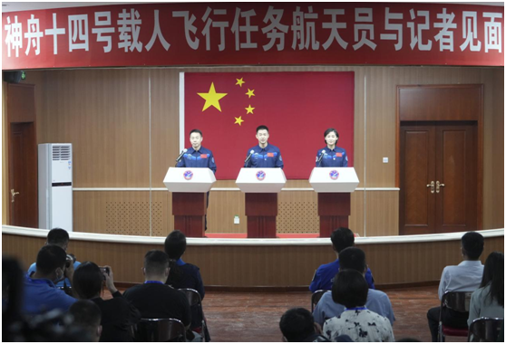 ↑神舟十四号载人飞行任务航天员与记者见面。新华社记者 李刚 摄