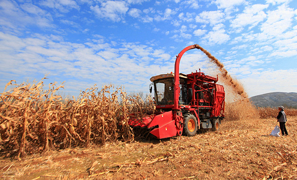 2021年10月23日,农民驾驶收割机在山东省临沂市平邑县流峪镇北申庄村田间收获玉米。(新华社发)