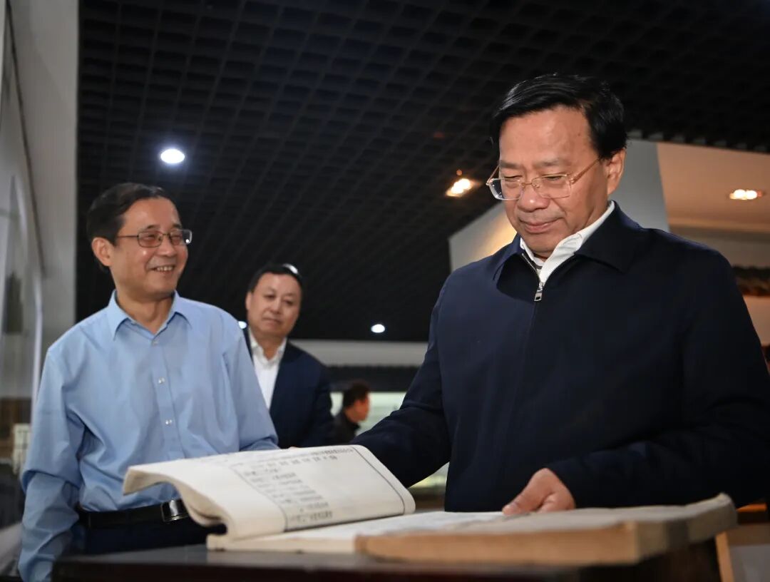 安徽博物院是首批国家一级博物馆、全国爱国主义教育示范基地和全国古籍重点保护单位。韩俊首先来到安徽博物院新馆,参观安徽文明史基本陈列,听取有关情况介绍。他指出,安徽作为我国南北交汇的中心地带、东部沿海向西部内陆过渡的桥梁纽带,南北文化在这里碰撞演变,各类文明在这里汇聚交流,独特的地理环境和文明积淀,使安徽成为中华文明重要发祥地和传承复兴地。自古以来,安徽人杰地灵、学风昌盛、人才辈出,历史文化灿烂辉煌,是不同时期演绎中华文明精彩华章的重要舞台。博物馆是历史文化记忆的宝库,要彰显地域特色,丰富馆藏文物,创新展览展示,推动文物活化利用,更好地传承中华优秀传统文化。